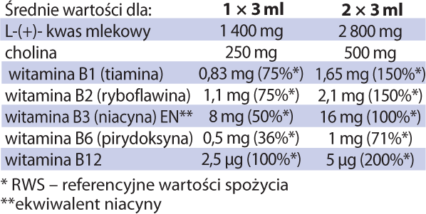 Zutaten: L-(+)-Milchsäure, Wasser, Cholinhydrogencitrat, Süßstoff Steviolglykoside, Nicotinamid, Calcium-D-Pantothenat, Riboflavin, Thiaminhydrochlorid, Pyridoxinhydrochlorid, Pteroylmonoglutaminsäure (Folsäure), D-Biotin, Cyanocobalamin.