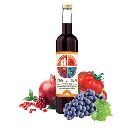 Polifenum Forte zawiera nowatorski ekstrakt polifenoli WSTC z pomidora, przefermentowane polifenole z granatu oraz resweratrol. Ten silny koncentrat wytwarzany jest z 75 pomidorów, 41 owoców granatu i 10 kg francuskich ciemnych winogron. Do jego wytworzenia użyto metody fermentacji Dr. Jacob’s, co zapewnia maksymalną bioaktywność składników.
