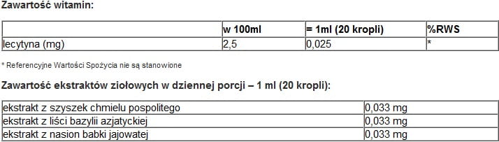 Zawartość ekstraktów ziołowych w dziennej porcji – 1 ml (20 kropli): ekstrakt z szyszek chmielu pospolitego - 0,033 mg, ekstrakt z liści bazylii azjatyckiej - 0,033 mg, ekstrakt z nasion babki jajowatej - 0,033 mg.