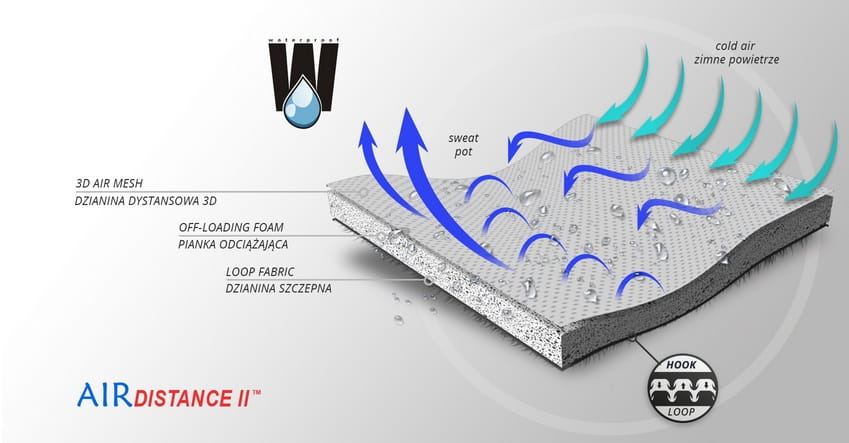 Wewnętrzna dzianina 3D o przestrzennej strukturze, pozwala na swobodne przepływanie przez nią powietrza , które dotlenia skórę oraz powoduje, że pot znajdujący się na jej powierzchni zdecydowanie szybciej odparowuje. Funkcja samoszczepna, surowca AirDistance II™ zdecydowanie ułatwia użytkowanie.