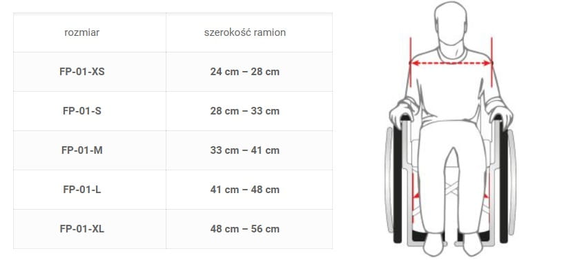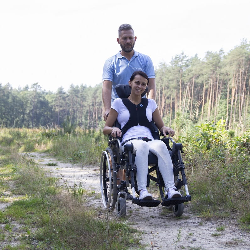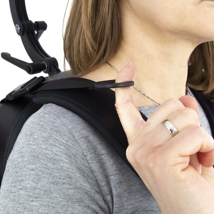Naramienne pasy kamizelki należy dopasować w pozycji siedzącej do szerokości ramion użytkownika. Górne pasy kamizelki powinny znajdować się między szyją a stawem barkowym użytkownika. Należy dopasować długość dolnych pasków tak, aby nie były luźne. Następnie należy wyregulować górne paski i ustawić kamizelkę tak, aby odpowiednio podpierała i stabilizowała użytkownika.