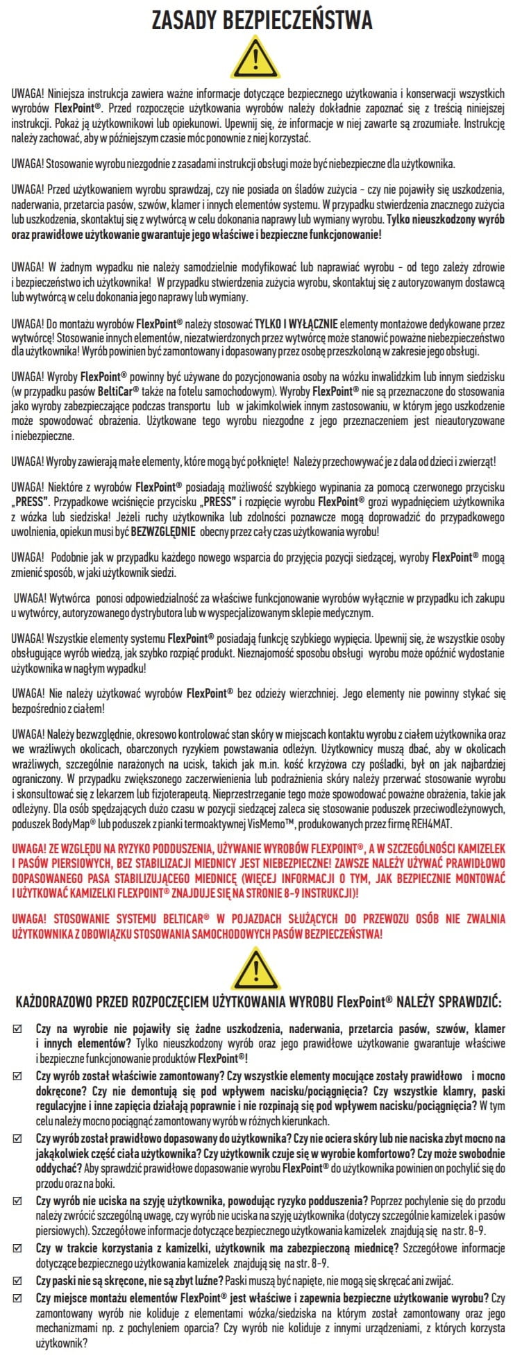 Uwaga! Kamizelka FlexPoint® powinna być używana razem z prawidłowo dobranym oraz zamontowanym pasem stabilizującym miednicę (np. FP-10 / FP-11). Użytkowanie kamizelki bez stabilizacji miednicy grozi zsunięciem się użytkownika z siedziska.