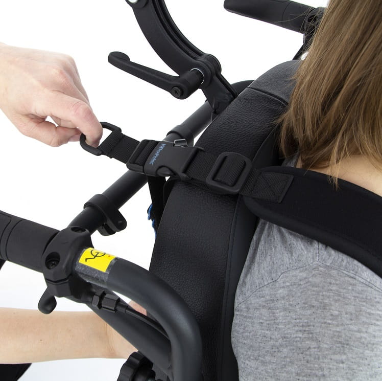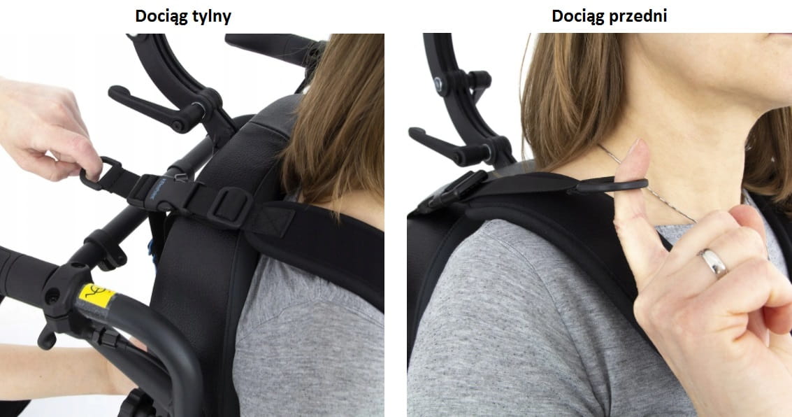 Kamizelka powinna być odpowiednio dopasowana, napięta i mocno dokręcona do wybranego elementu wózka, aby tułów użytkownika był stabilny i bezpieczny. Niewielkiej korekty dopasowania kamizelki można dokonać przy użyciu systemu Chwyć i Pociągnij™.