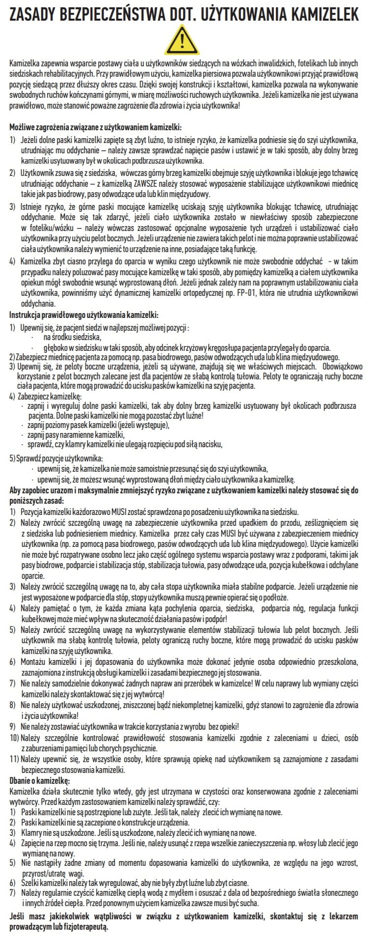 Uwaga! Kamizelka FlexPoint® powinna być używana razem z prawidłowo dobranym oraz zamontowanym pasem stabilizującym miednicę (np. FP-10 / FP-11). Użytkowanie kamizelki bez stabilizacji miednicy grozi zsunięciem się użytkownika z siedziska.