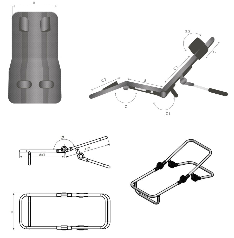 Innowacyjny system przegubowy z szerokim zakresem regulacji stelaża pozwala w pełni dopasować leżaczek do wymiarów i potrzeb pacjenta.