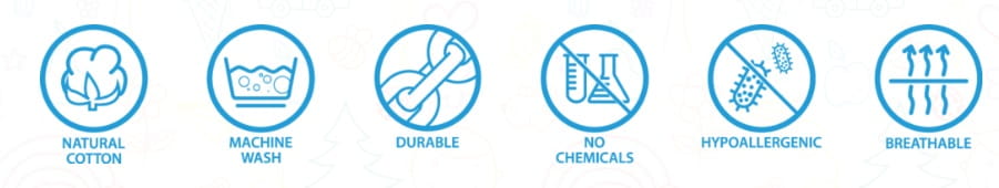 Używane materiały zostały zbadane pod kątem istnienia substancji szkodliwych oraz posiadają międzynarodowy certyfikat Oeko-Tex Standard 100 Klasa I. Poduszka jest w pełni bezpieczna w kontakcie ze skórą dziecka.